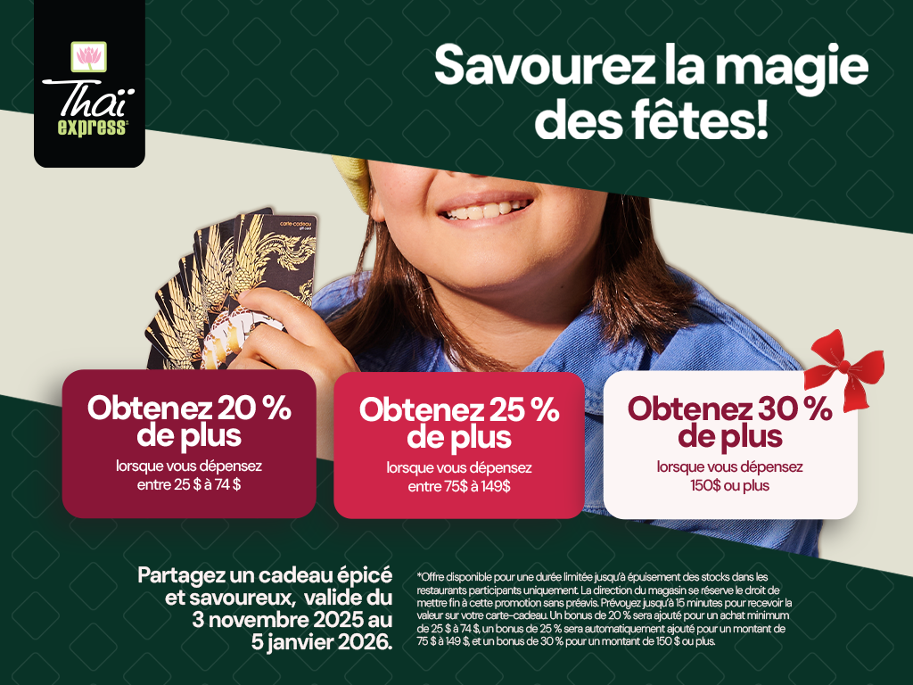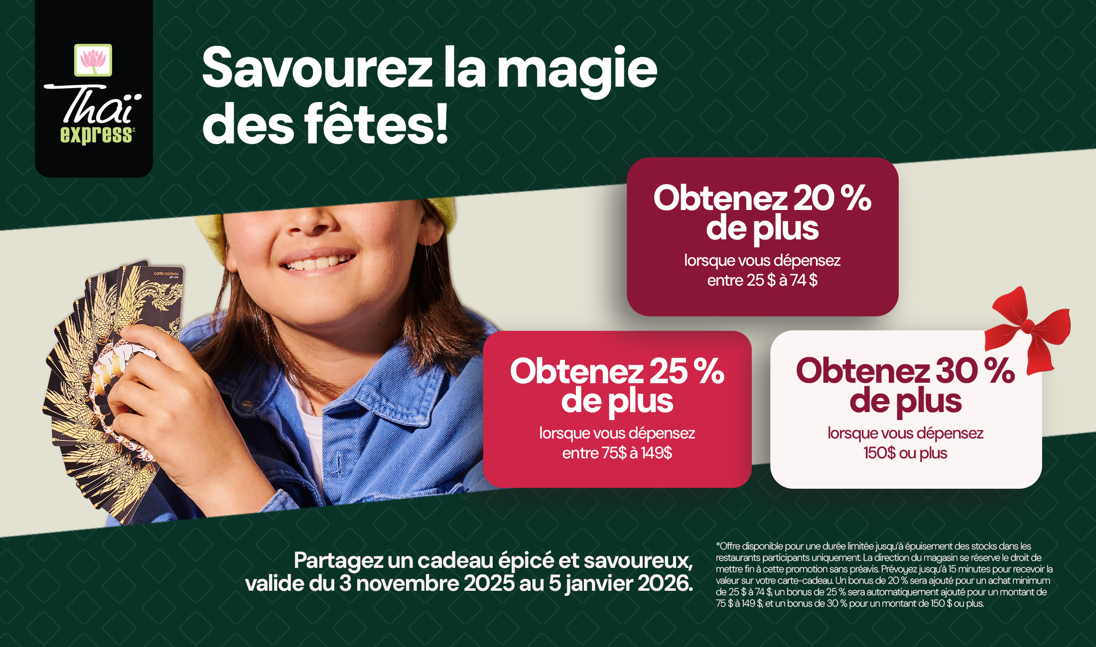 Grève de Postes Canada : En raison de la grève en cours de Postes Canada, il nous est impossible d’expédier des cartes-cadeaux physiques pour le moment. Pour obtenir une carte-cadeau physique, veuillez visiter un restaurant participant près de chez vous. Nous nous excusons pour ce désagrément.